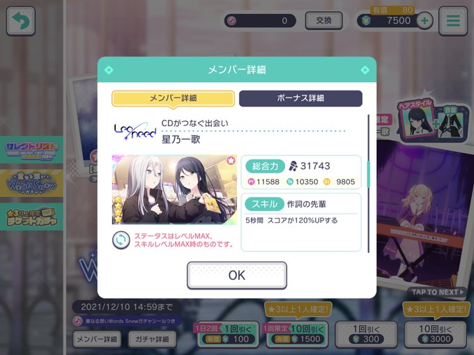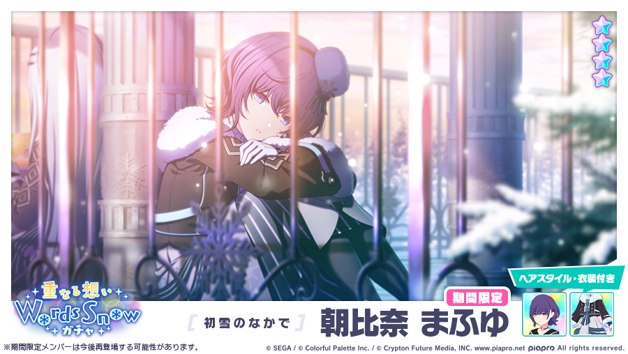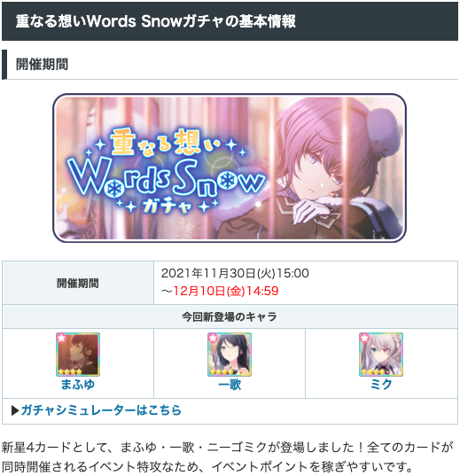 期間限定ガチャ「重なる想いWords Snow」も同時開催されました!まふゆと一歌は2枚目となる限定メンバーとして実装されています。2連続ニーゴ限定&先月一歌限定とは...😭