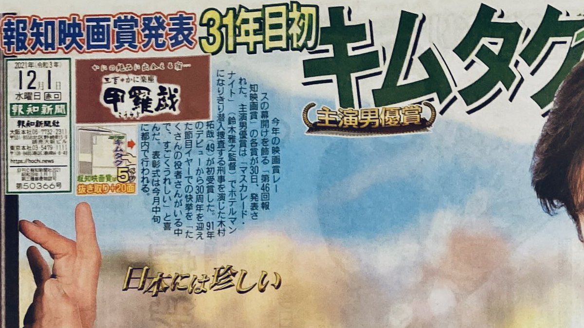 木村拓哉、報知映画賞主演男優賞受賞 主演女優賞は永野芽郁 #報知映画賞 #木村拓哉 #永野芽郁 #マスカレードナイト #そしてバトンは渡された crank-in.net/news/97103 pic.twitter.com/hVN68pqQSV