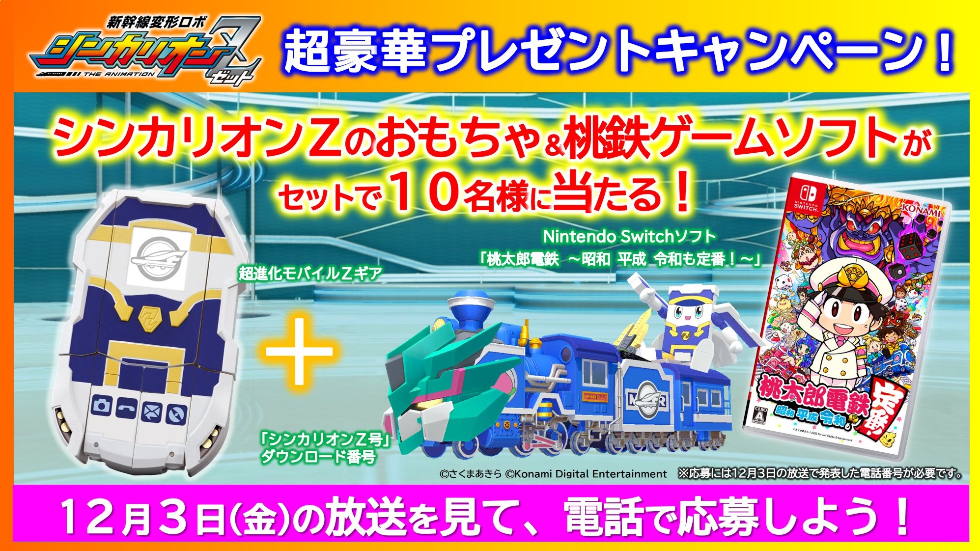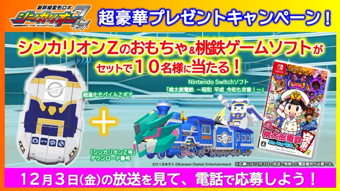 本日放送の『新幹線変形ロボ シンカリオンZ』で、豪華賞品が当たる「超豪華プレゼントキャンペーン」を実施します!番組のどこかで発表される電話番号をチェックして応募しよう! #シンカリオンZ pic.twitter.com/wTDK6GM59Z