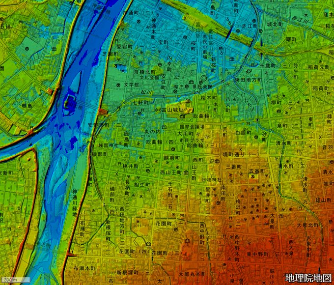 #ブラタモリ で紹介されている富山城付近を、地理院地図の色別標高図で1m間隔で表示しました。旧神通川と自然堤防による高まりと城の立地、この図からもよく分かりますね。 #地理 #地図 pic.twitter.com/W7pVpWqmxo