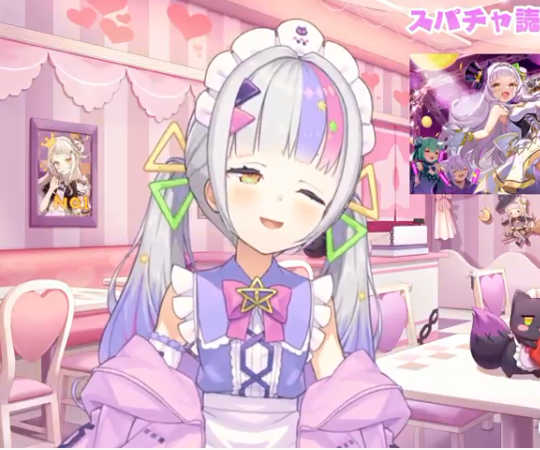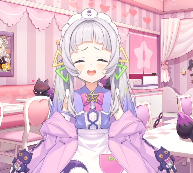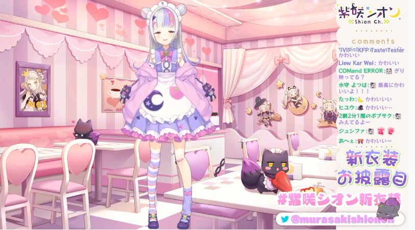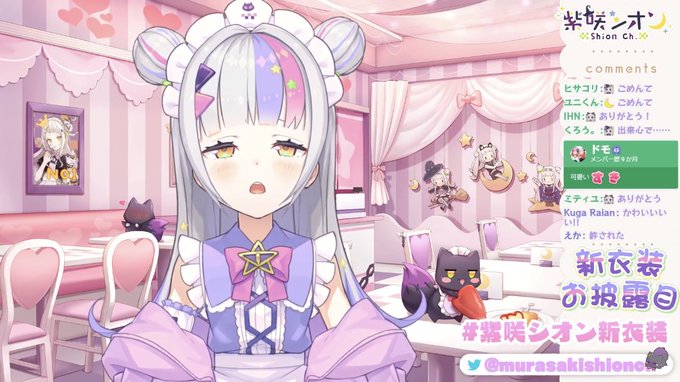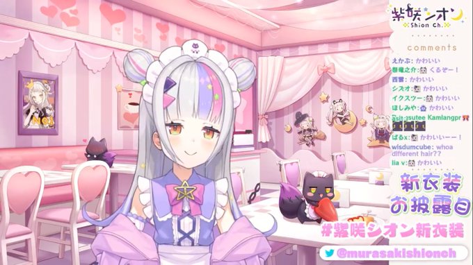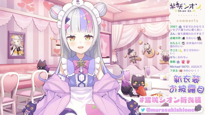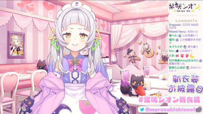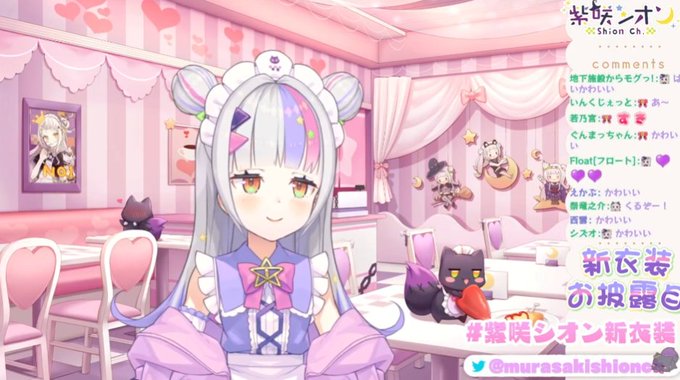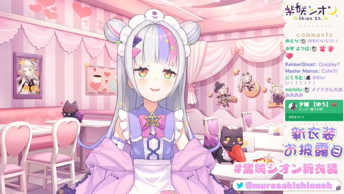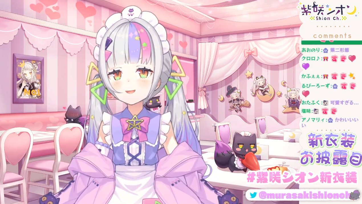 様々な予想が採用され次からどんなシオンちゃんが見られるのか楽しみですと冗談はさておき、ウルトラスーパーかわいい新衣装、最高です。パステルイメージなふわふわメイドさん×伸ばした前髪のお姉さん感×挑戦的なメッシュ=宇宙一かわいい!