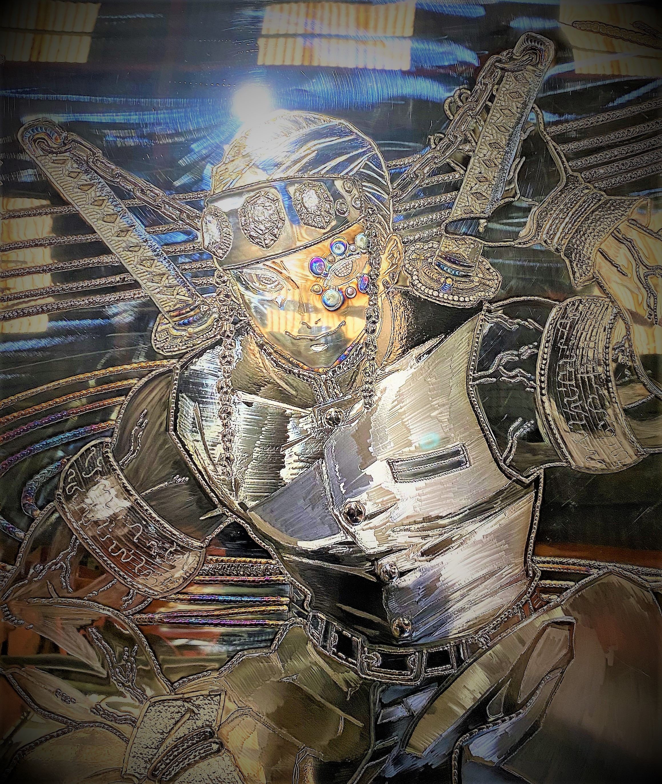 金、銀、青がきらびやかに輝くド派手なライティング。装飾品をイメージした金色がアクセント。」