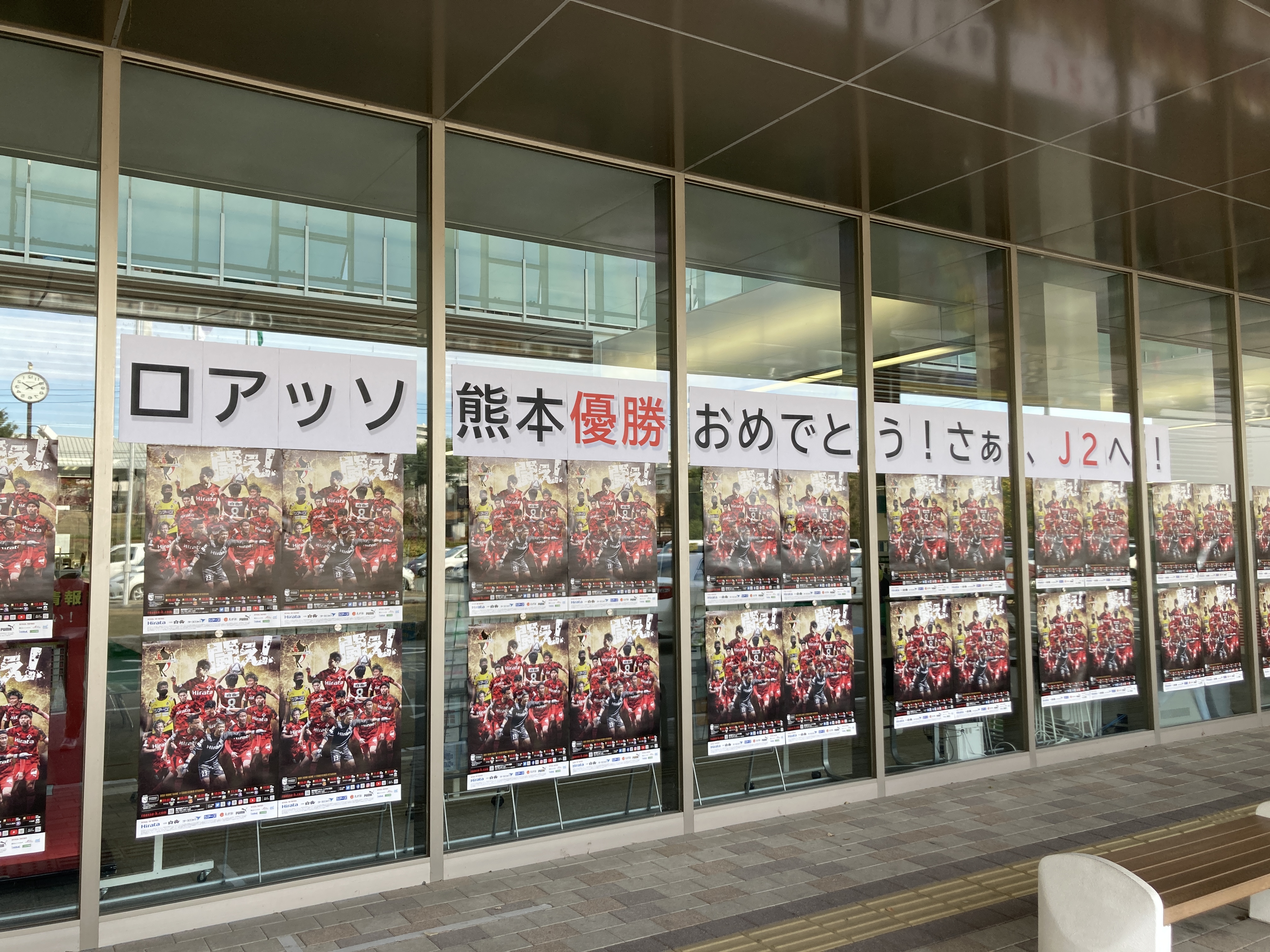 ロアッソ熊本を愛する全ての皆様、J3優勝&J2昇格おめでとうございます!選手・チームの皆様、感動をありがとうございます。感謝の気持ちを込めて東区役所にメッセージを掲示しています。