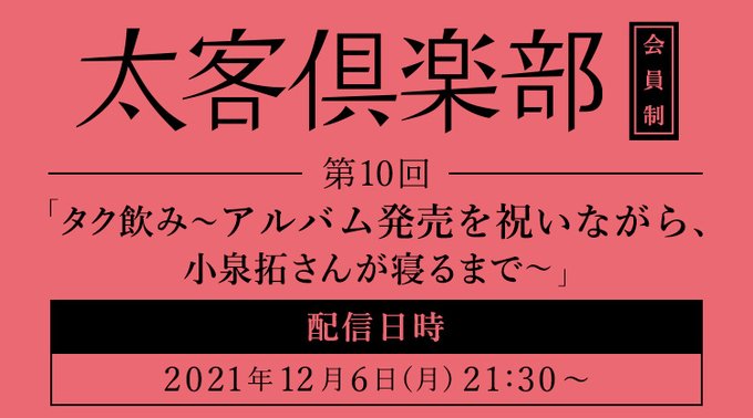 まもなく「太客倶楽部」会員限定で 第10回『タク飲み〜アルバム発売を祝いながら、小泉拓さんが寝るまで〜』を生配信!
