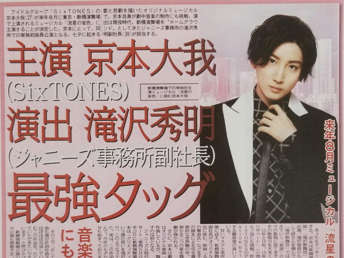 SixTONES京本大我、ミュージカル単独初主演&テーマ曲を作詞作曲❗滝沢秀明演出のオリジナル作『流星の音色』新橋演舞場で来年8月上演✨