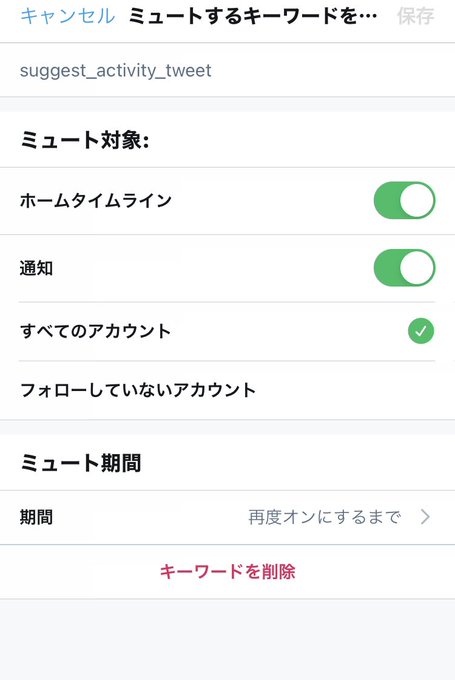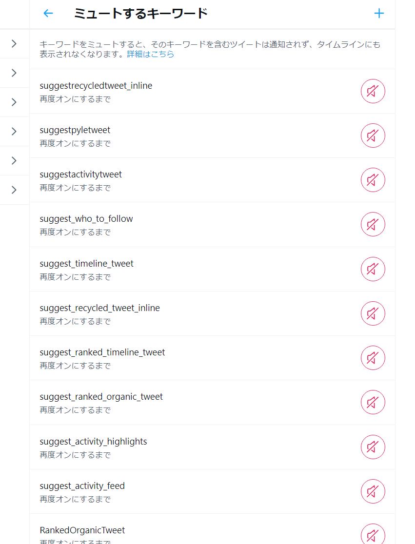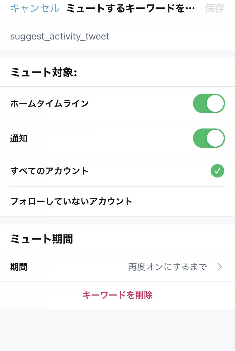 Twitterのミュートキーワードにこれらの文字列を追加すれば、「誰々がこんなツイートにいいね・リプライをしている」「おすすめのユーザーやトピック」といった余計な情報がタイムラインから完全に非表示になる。