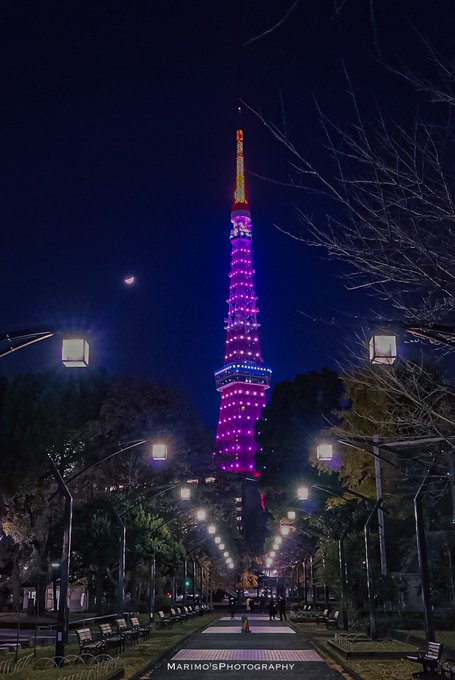 東京タワーが紫で綺麗。寄り添うは宵月。なんか今夜だけ #乃木坂46 仕様カラーらしいです