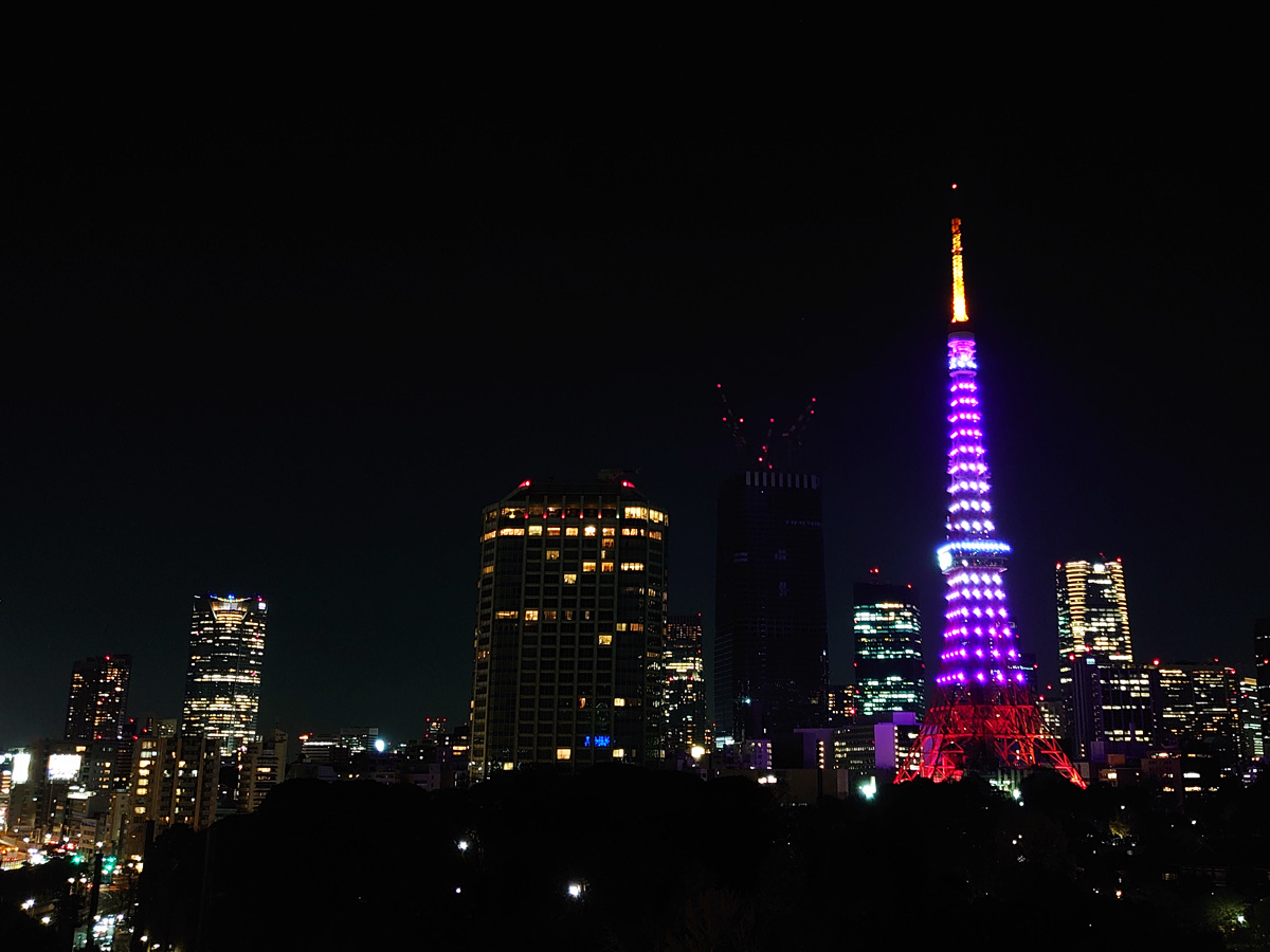 夜空に浮かぶ紫のタワーも綺麗です。周りの建物も淡く紫に染まって幻想的。一夜限りのスペシャルライトアップ🗼