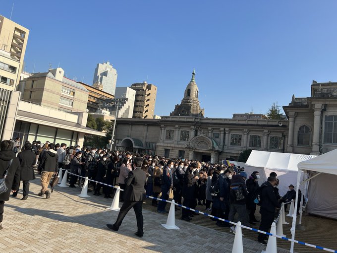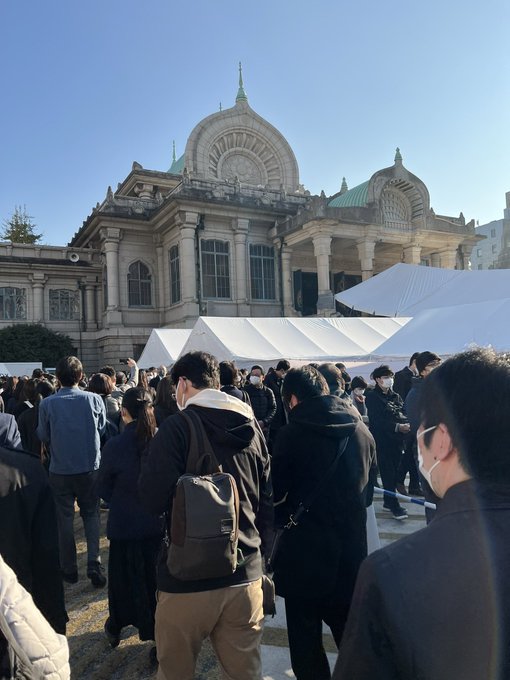 すぎやま先生のお別れ会、献花の列に並んでいます。今のところ、手荷物検査まで1時間くらいのようです。