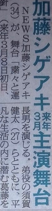 #NEWS の #加藤シゲアキ が来年3月に舞台「#粛々と運針」に主演することが分かった。加藤は「運命めいたいくつもの時が織りなされて、描かれる家族の物語に、ひとつの編み針として参加できることを、心より光栄に思います」と熱演を約束した。