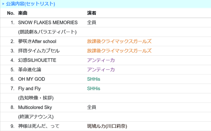 【シャニマスクリパ】DAY2ご視聴いただきありがとうございました!! 本日のセットリスト&告知内容まとめはこちら! #シャニマス #シャイニーカラーズ #シャニマスクリパ_DAY2 #idolmaster →→idolmaster-official.jp/news/01_2995.h… pic.twitter.com/lmaKkaW44D