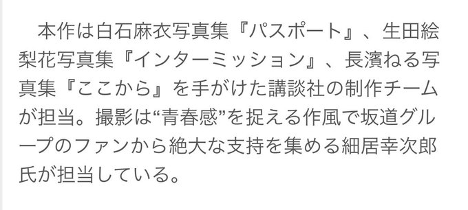 「本作は白石麻衣写真集『パスポート』、生田絵梨花写真集『インターミッション』、長濱ねる写真集『ここから』を手がけた講談社の制作チームが担当。」