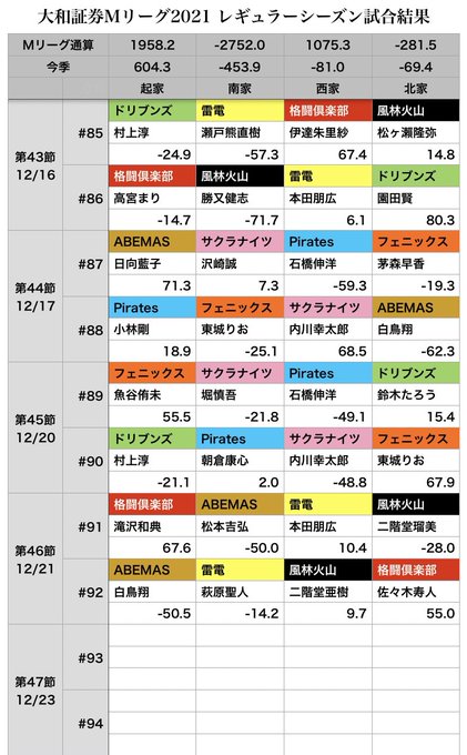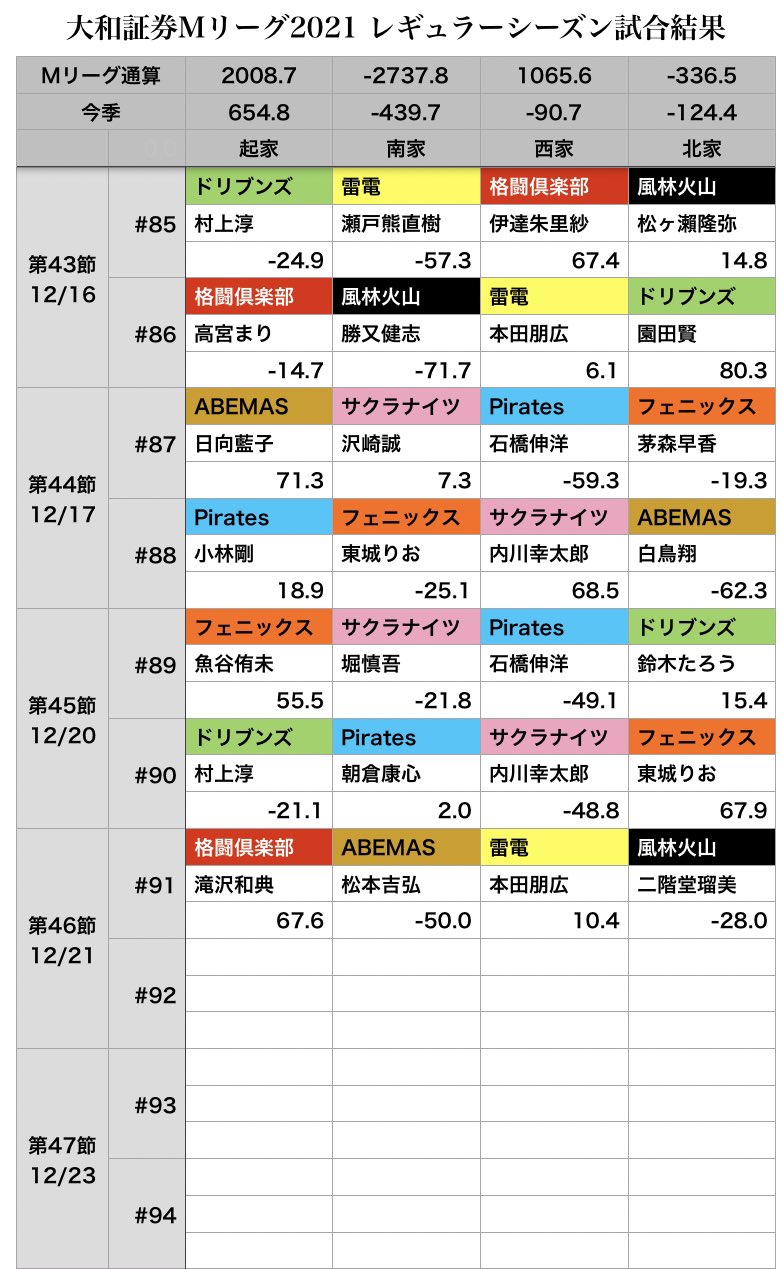 #Mリーグ 12/21(火)試合結果