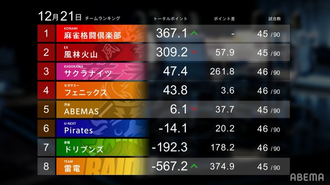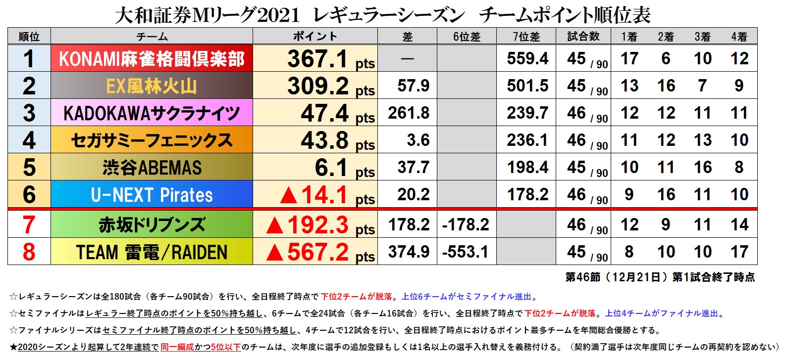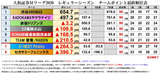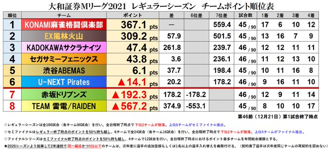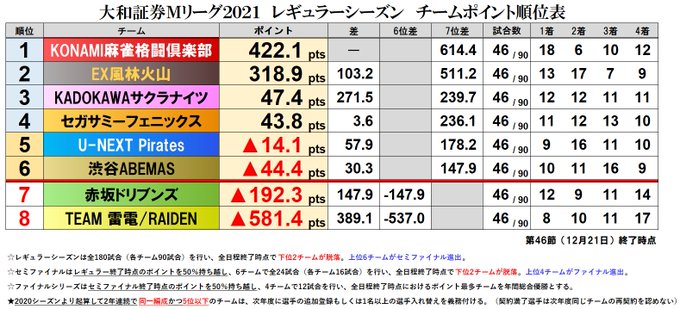 大和証券 #Mリーグ 2021【チーム成績順位表】