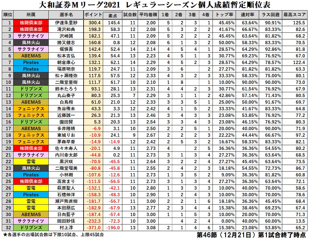 大和証券 #Mリーグ 2021【個人成績順位表】