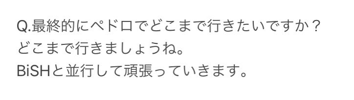 本当に沢山PEDROに助けてもらいました。アユニちゃんが言っていた様に、PEDROが活動休止しても今までの思い出は全部全部本当でいつまでも心の中で素敵な思い出になって残っています。PEDROチームに会える時まで沢山PEDROの曲を聞いて頑張りたいです。