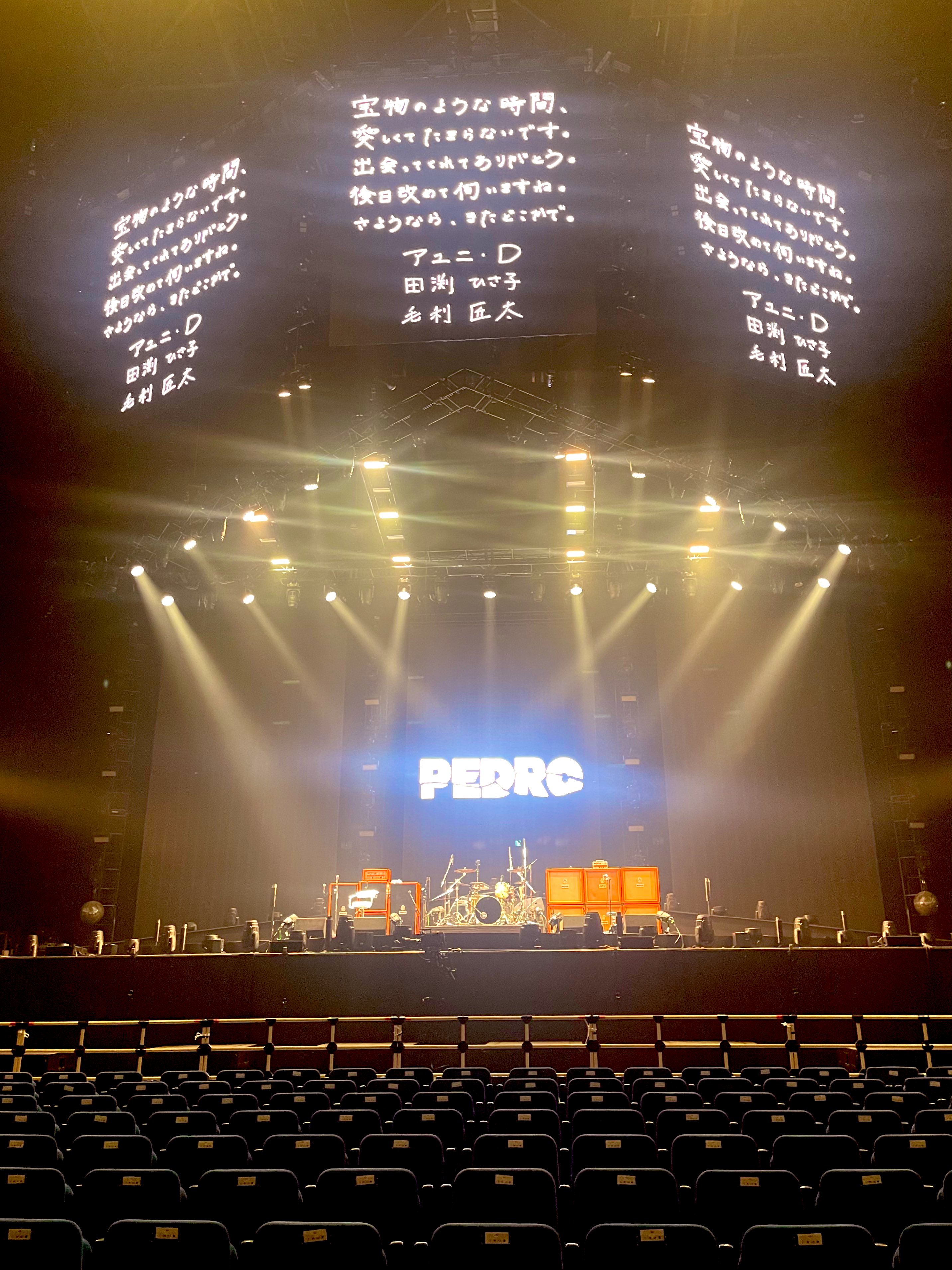 最後はアンコールなし、メンバーが退場後もスタンドに置いたギターがフィードバック(ハウリング)でずっと音が鳴ったままの演出が、自分にはまるでこの先もPEDROの音楽がファンの中に生き続け鳴り続けるようにとの想い願いを表現している様に思えて素敵だった
