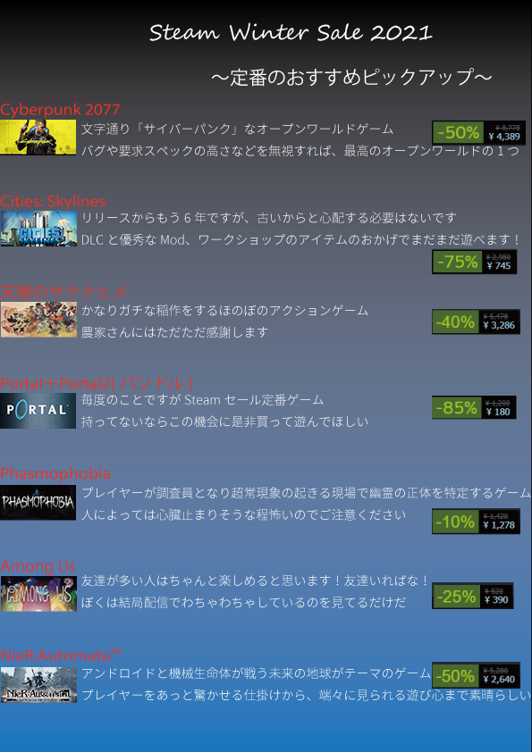 Steamウィンターセール2021がきちゃああ!!!というわけで何番煎じかわかりませんが、セール対象のゲームの中でオススメのゲームの厳選してまとめたので「何買おうかなぁ」と迷っている方は是非参考にしてみてください!!!