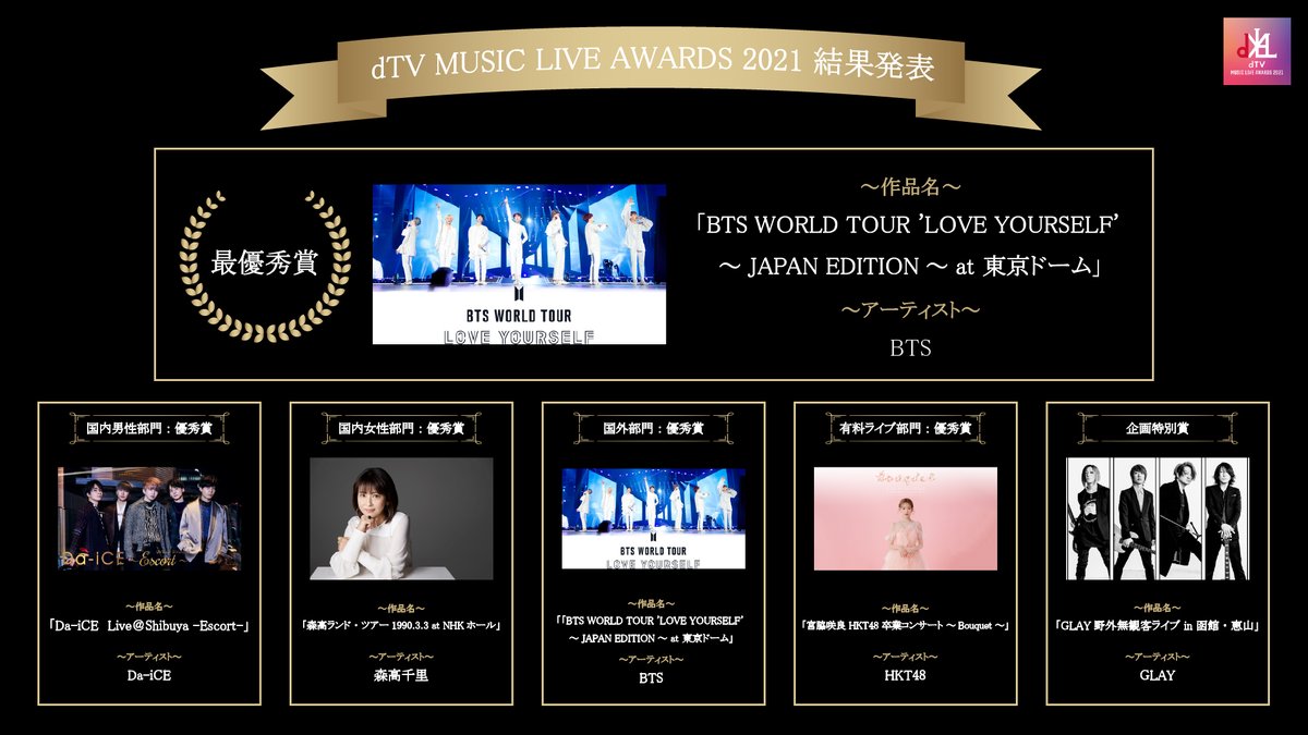 「dTV MUSIC LIVE AWARDS 2021」最優秀賞はBTSのライブ作品(写真 全6枚)