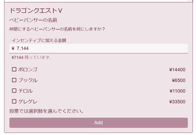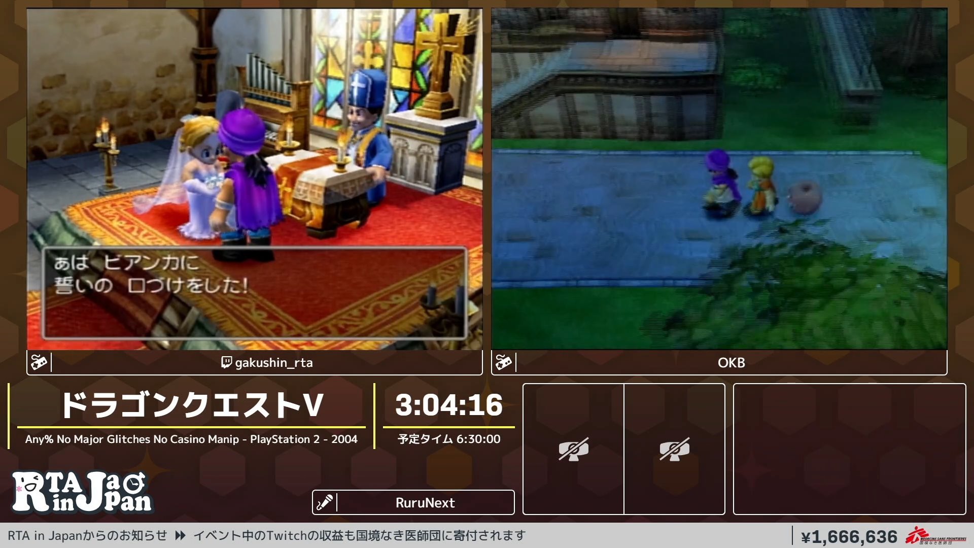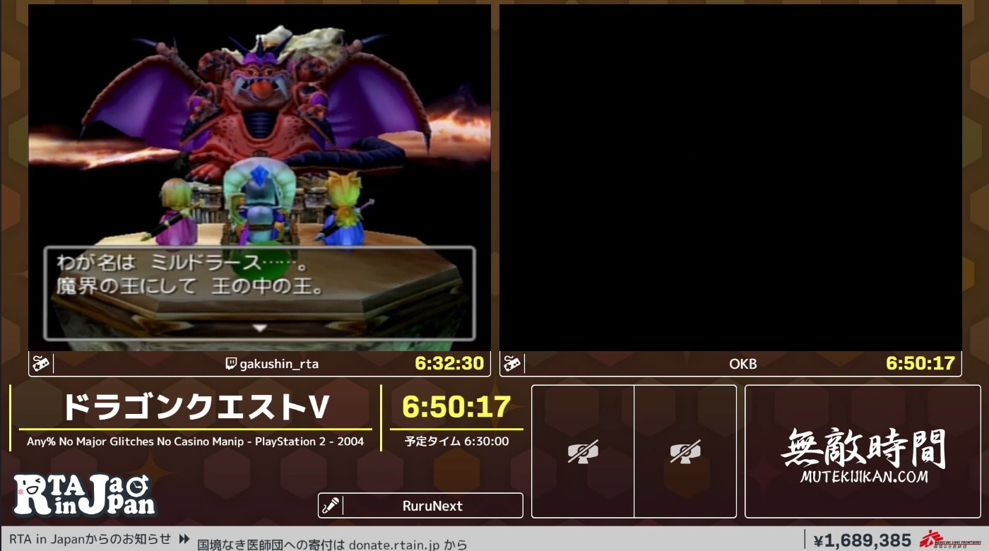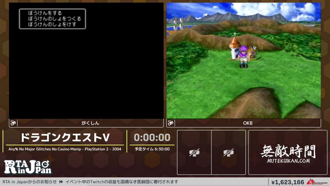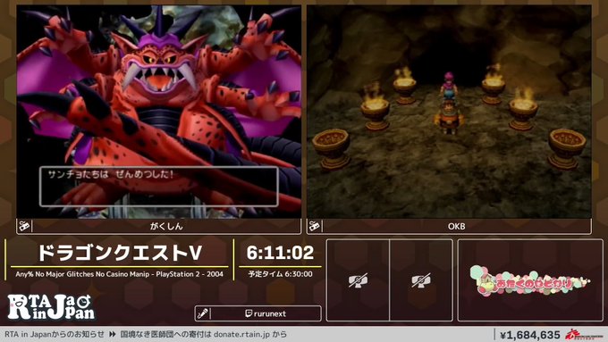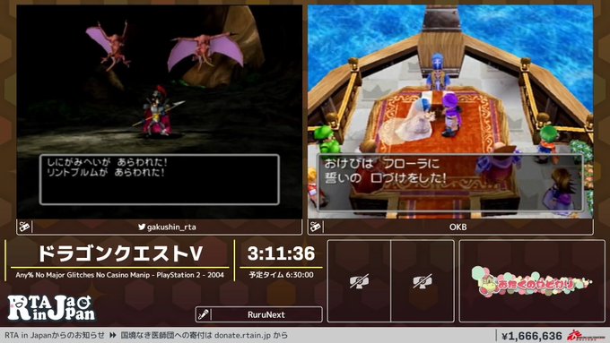 RTAinJAPAN Winter 今年はツイッターのアンケじゃなくて、国境なき医師団への寄付金でRTA中の一部の要素に要望だせるようになってるんだけどDQVのRTAへのリクエストで札束による場外乱闘がはじまってた… 今のところフローラ派有利