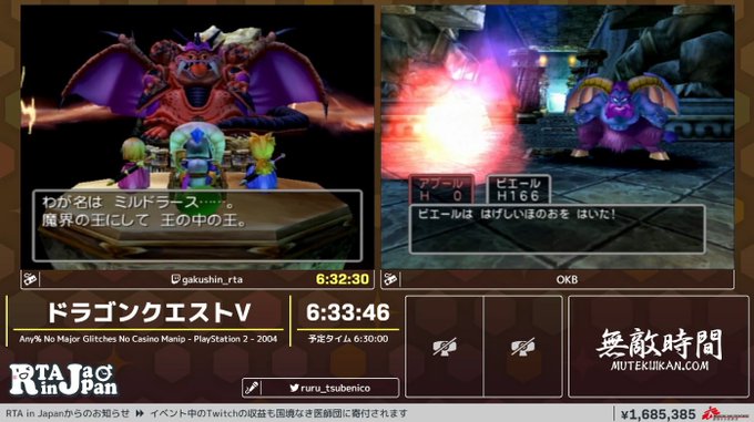 走者のがくしんさん(@gakushin_rta)キラーマシンにヒヤッとしながらもリベンジマッチで無事ミルドラースを撃破。タイムは06:32:30です。