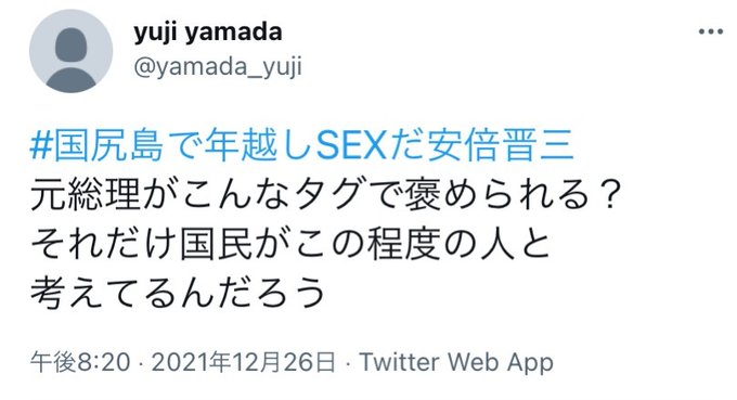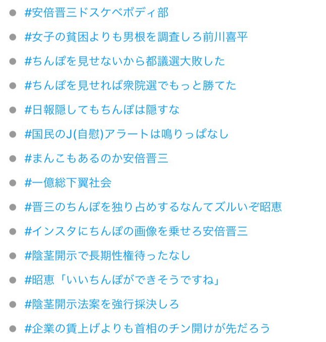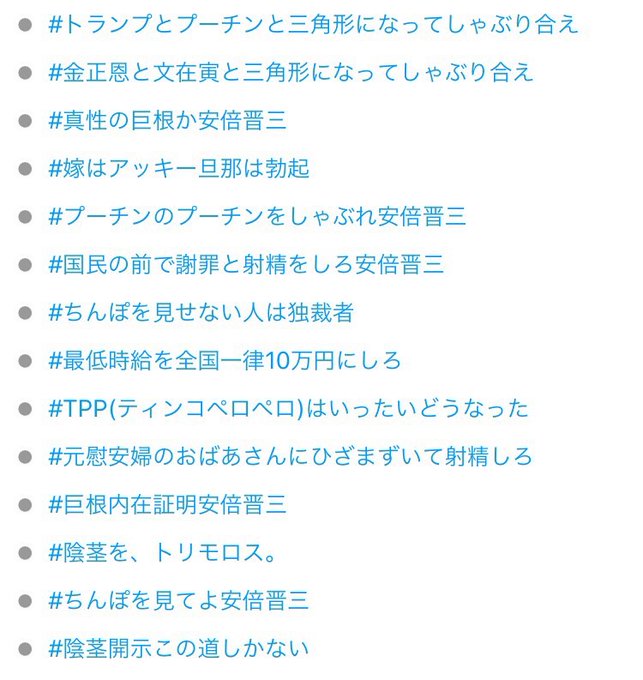 #国尻島で年越しSEXだ安倍晋三 がトレンド入りしてるが安倍晋三氏に対してハッシュタグがこんなに作られているうえなんならこれらのタグすら氷山の一角にすぎないことを忘れてはいけない pic.twitter.com/TKtwyXqyMm