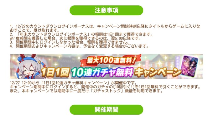『ゆく年くる年キャンペーン第1弾』で本日12時より1日1回10連ガチャが無料に!