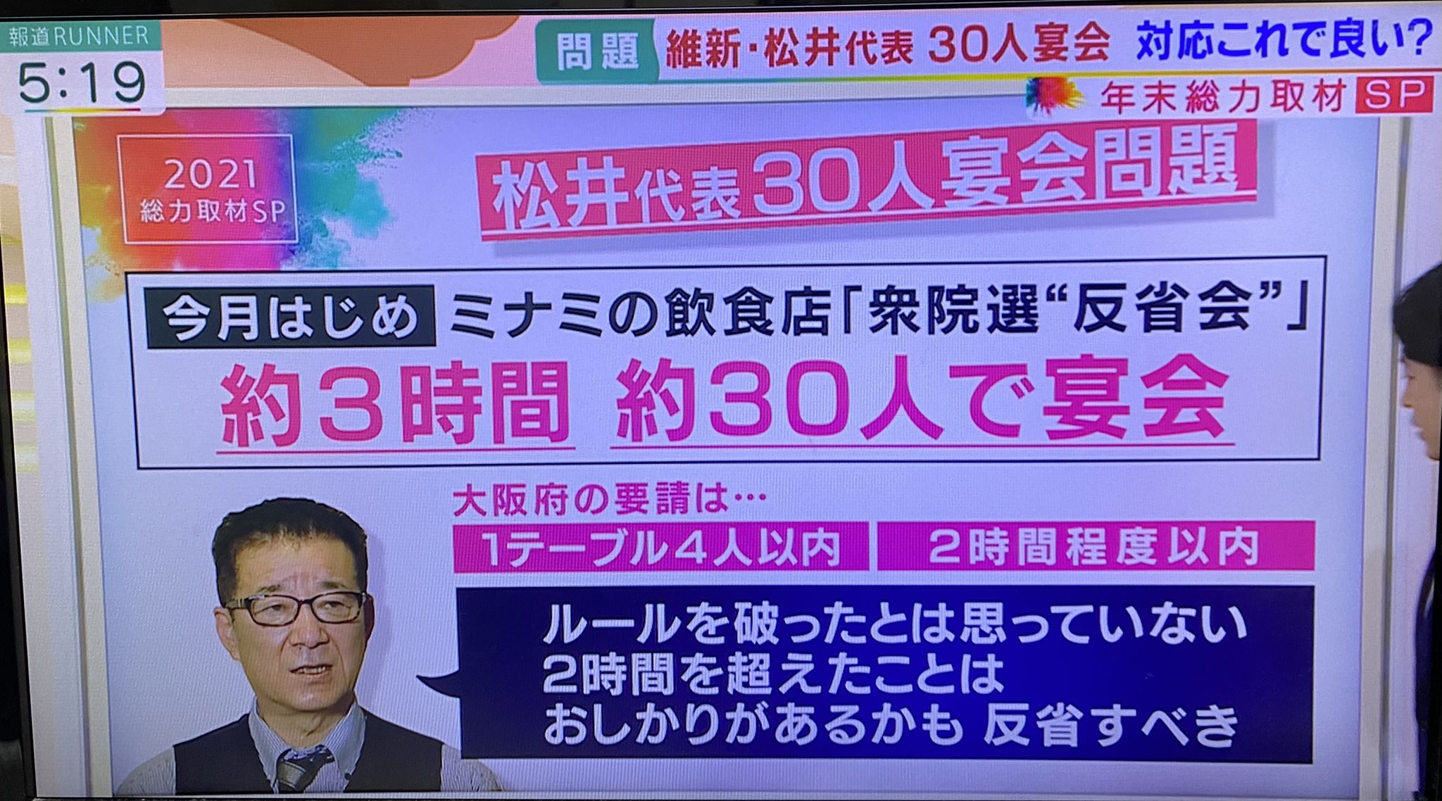 松井市長のコロナ禍での大宴会の件、「(人数や時間などの)緩和に向けて話し合っていた時期だから」と吉村知事の言い訳。緩和決定でない時期に、同じことを府市職員がしたら、同じ対処ができたのか。それを問いたい。 pic.twitter.com/h4KeX088DI