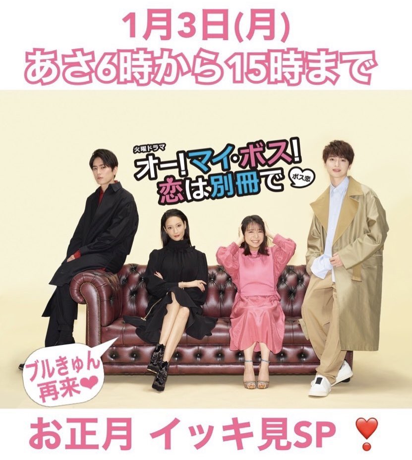 来年お正月1月3日に #ボス恋イッキ見SP で奈未ちゃんが!麗子さんが!潤之介が!中沢先輩が!帰って来ます❣️ぜひぜひ一緒に #ぶるキュン しちゃいましょう☃️☔️🦀🎂🍖🌃🐶