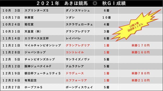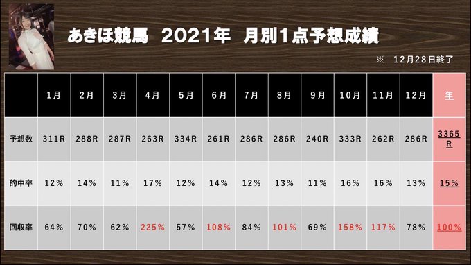 RTは今朝あげた、2021年のあきほの競馬成績でした✨