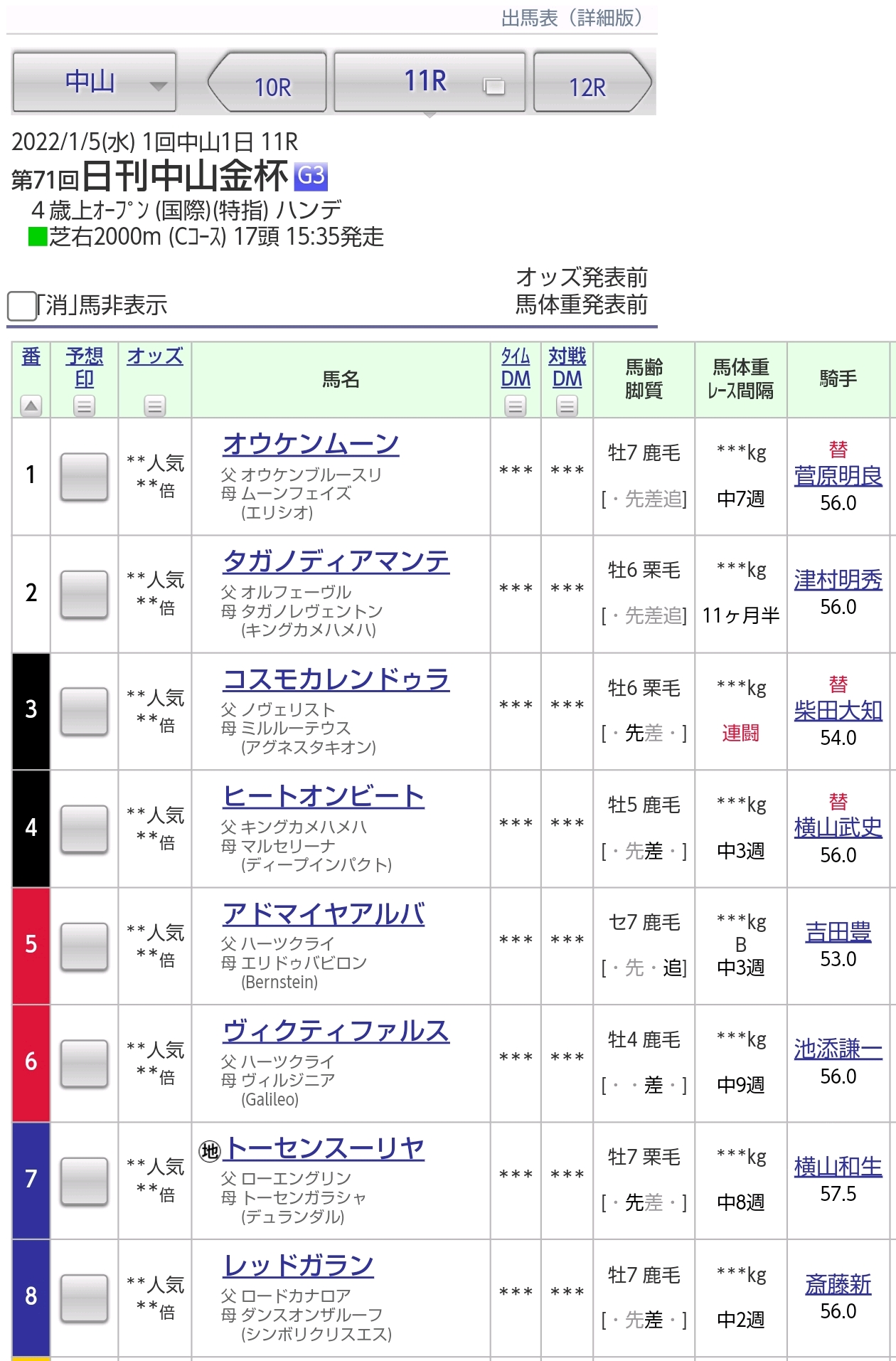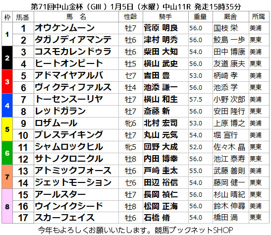 2022年1月5日(水曜)に行われる第71回中山金杯(G3、中山・芝2000m、15時35分発走)の枠順が確定しました。