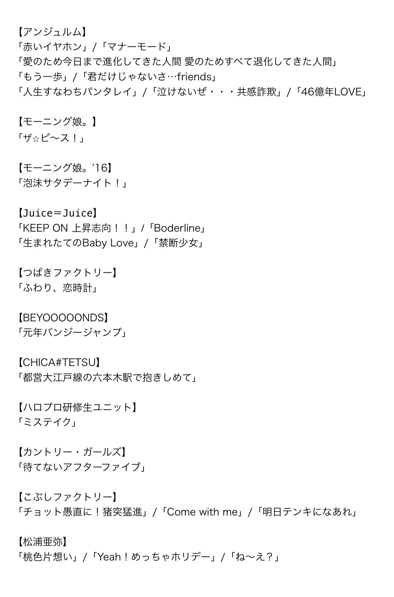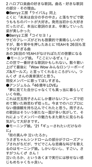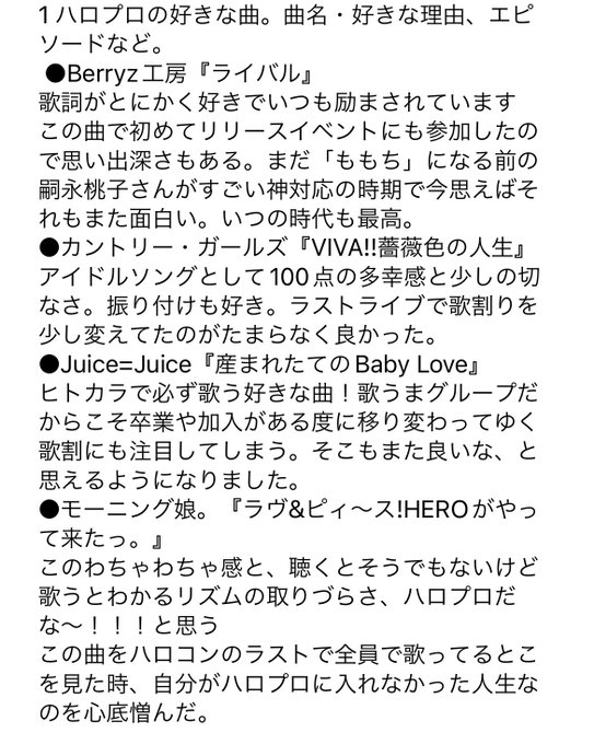 「ハロヲタのオールナイトニッポン」、ありがとうございました。ハロー!プロジェクトの歴史や魅力を新たに知ることができて嬉しかったです。ハロー!の好きな曲、現時点で知る限りですが他にも挙げてたので貼っておきます。アンジュルムを好きになって1年、暮らしが楽しくなりました。