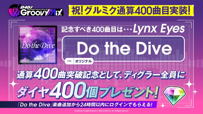400曲目となるLynx Eyesの「Do the Dive」実装から[24時間以内]にログインしたディグラー全員がゲットできるので、お見逃しなく👀✨