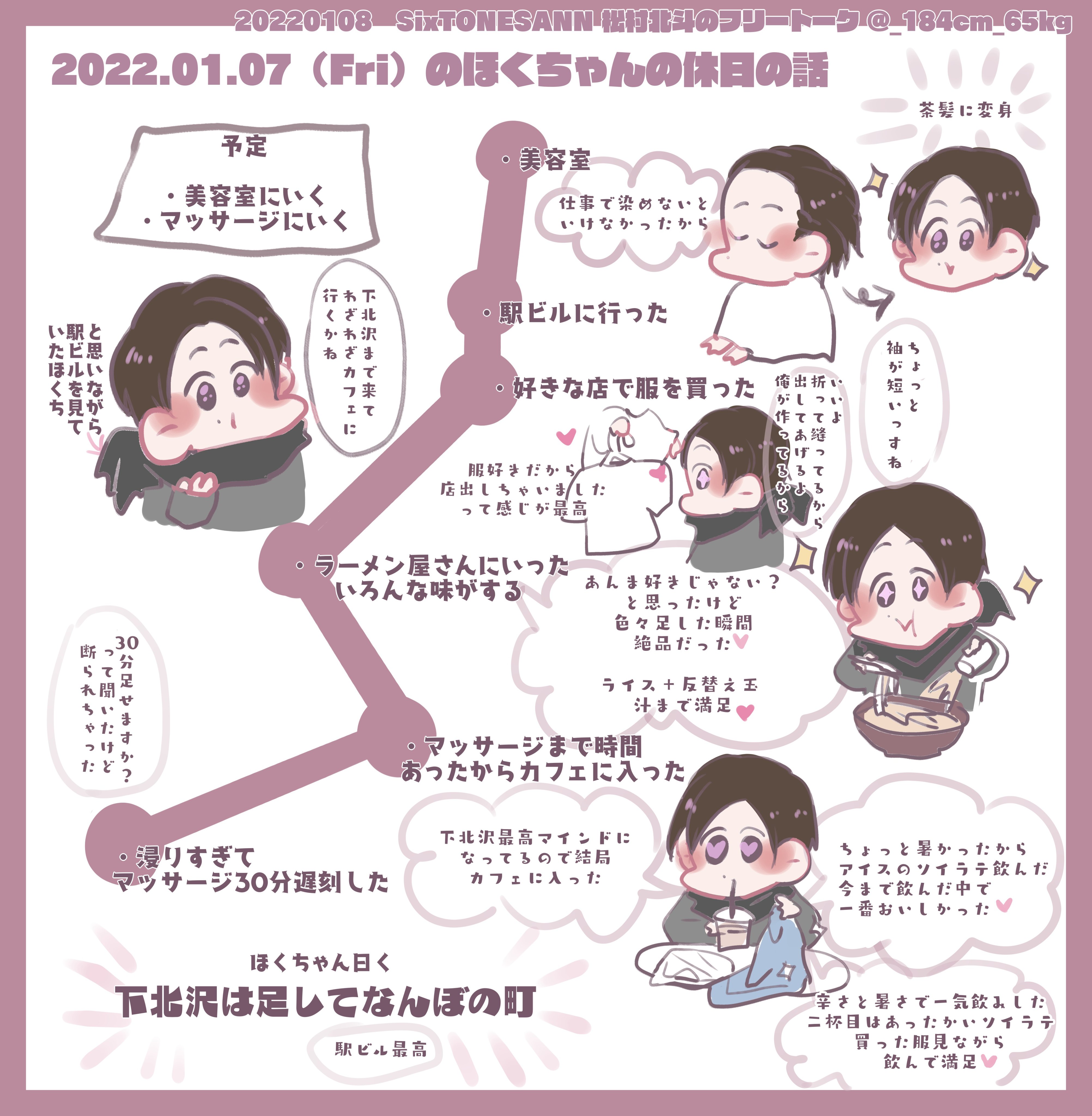 髪染めて下北沢行って、服買って、ラーメン半替え玉して食べて、コーヒーショップ行ってソイラテ飲む松村北斗。