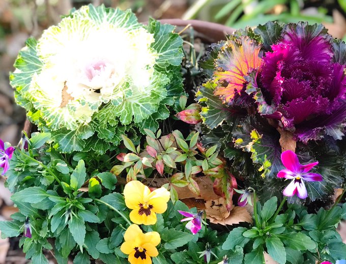 花壇の葉牡丹とパンジーも
