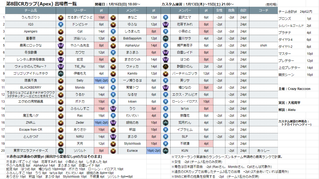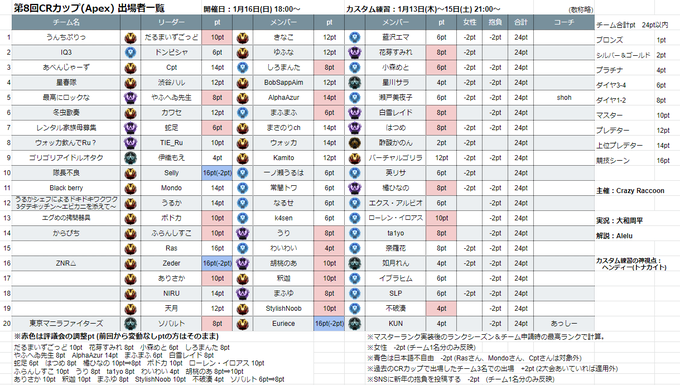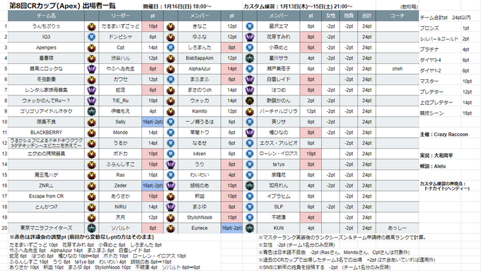 ■第8回CRカップのメンバー表を更新しました。