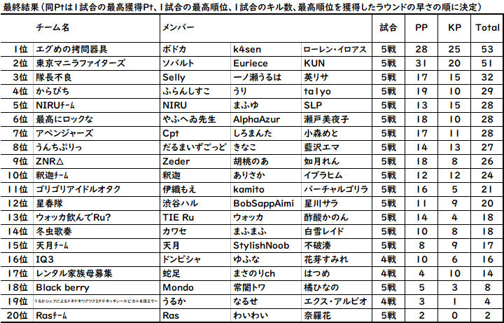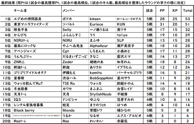 ※1戦目はリザルトバグのため、キルpt未考慮