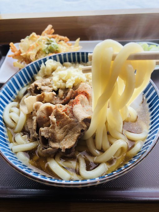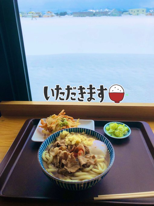 窓から見える雪景色を見ながら食べる温かいうどんは格別です☺️