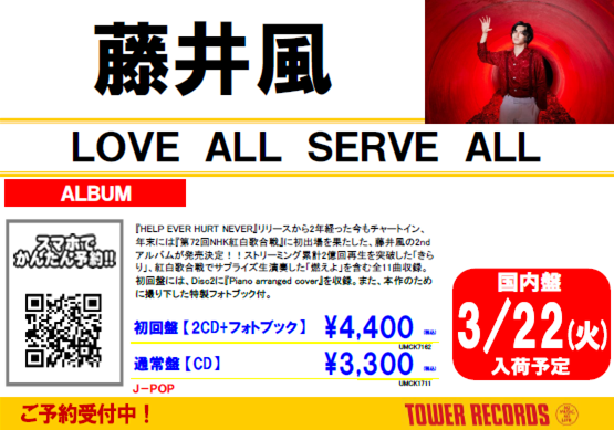 【#藤井風】待望すぎる!!2ndアルバム『LOVE ALL SERVE ALL』3/23(水)発売決定!「へでもねーよ」「青春病」「旅路」、ストリーミング累計2億回再生を突破した「きらり」、紅白歌合戦でサプライズ生演奏した「燃えよ」に、未発表6曲を含む全11曲入り😭✨