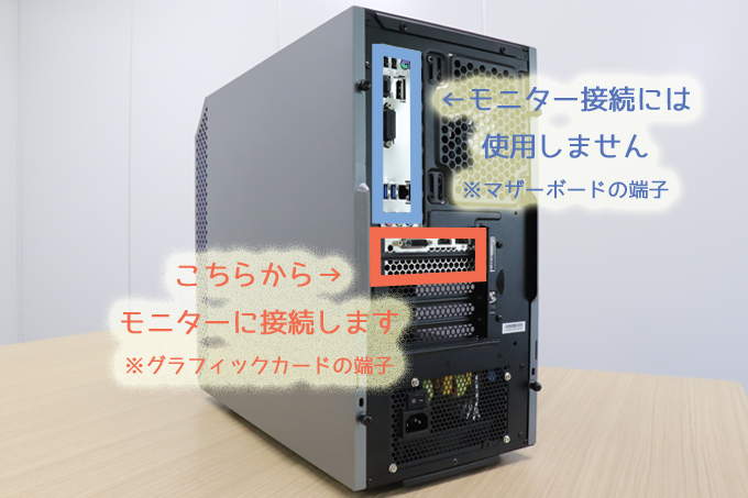 グラフィックカード(赤枠)からモニターに接続しないと、性能を発揮できません(>_< )!!