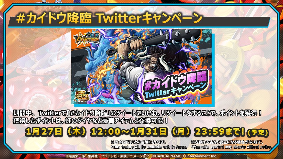 「#カイドウ降臨 」がついたツイートに「いいね」「RT」をして『ポイント』を獲得!『ポイント』はゲーム内アイテムと交換できるぞ!