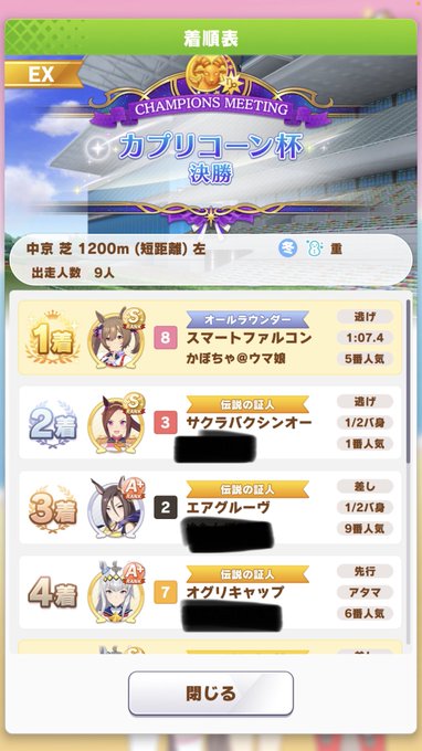 やりました😭本当ここまでよくやってくれました。ファルコは前走不調で心配でしたが最後は素晴らしい逃げ切りでした∩'ー`∩対戦ありがとうございました!GG!!