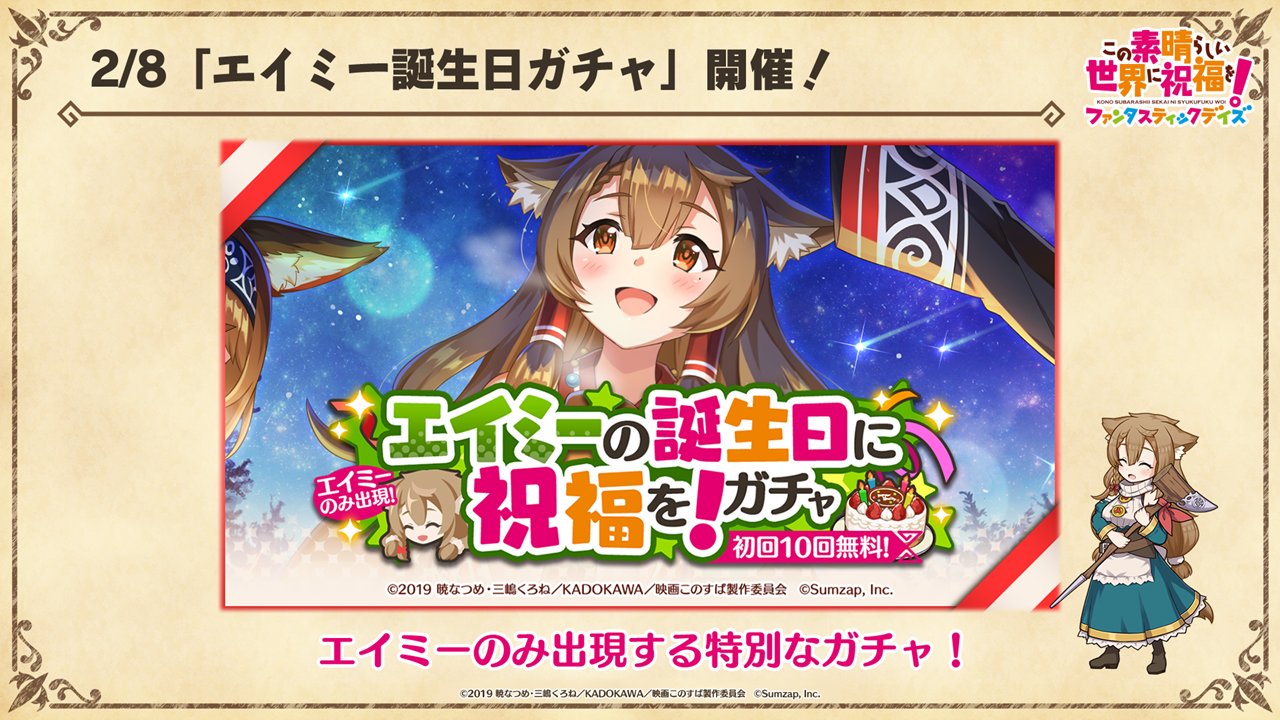 エイミーのお誕生日も、2周年も‼️もうすぐ🎉💚これからもよろしくね…! twitter.com/konosubafd/sta… pic.twitter.com/8LhJEEeJgz