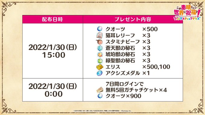 「無料5回ガチャチケット」や「クオーツ」がもらえる「生放送記念ログインボーナス」が本日より開催中🥳✨