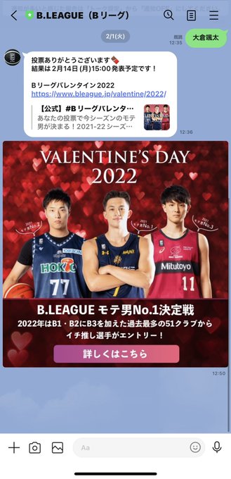 【本日最終日】B.LEAGUEモテ男 No.1決定戦🍫❣️もうLINEでの投票はお済みですか?👀期間中1回、#Bリーグ のLINE公式アカウント宛に「 大倉颯太」と返信するだけ📩まだ投票お済みでない方はぜひお願いします✨