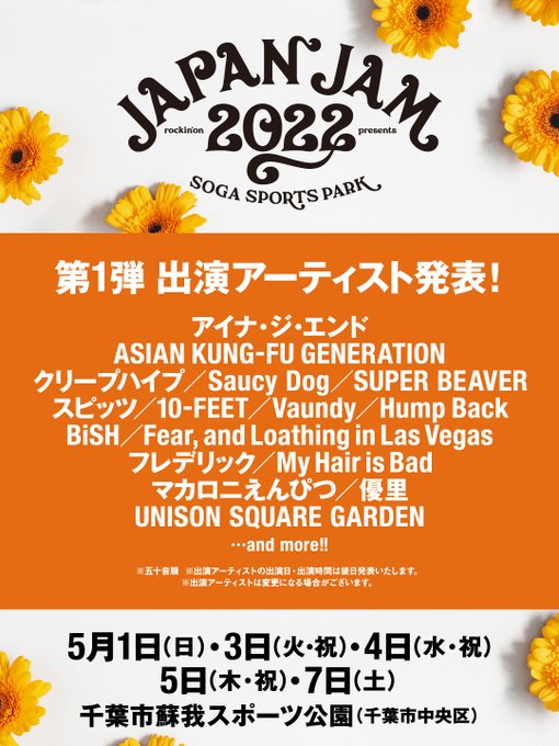 5/1(日)・3(火・祝)・4(水・祝)・5(木・祝)・7(土)千葉市蘇我スポーツ公園にて開催される「rockin’on presents JAPAN JAM 2022」に出演します!