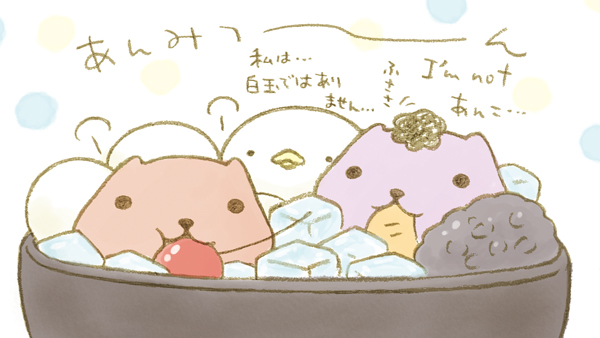 あずき寒天「本日は寒天の日だそうです。寒天には食物繊維のほかにもかるしうむなどの栄養が含まれていて、とても健康に良いのですよ。様々なあれんじを共に試して、美味しく頂いて健康になりましょうね」