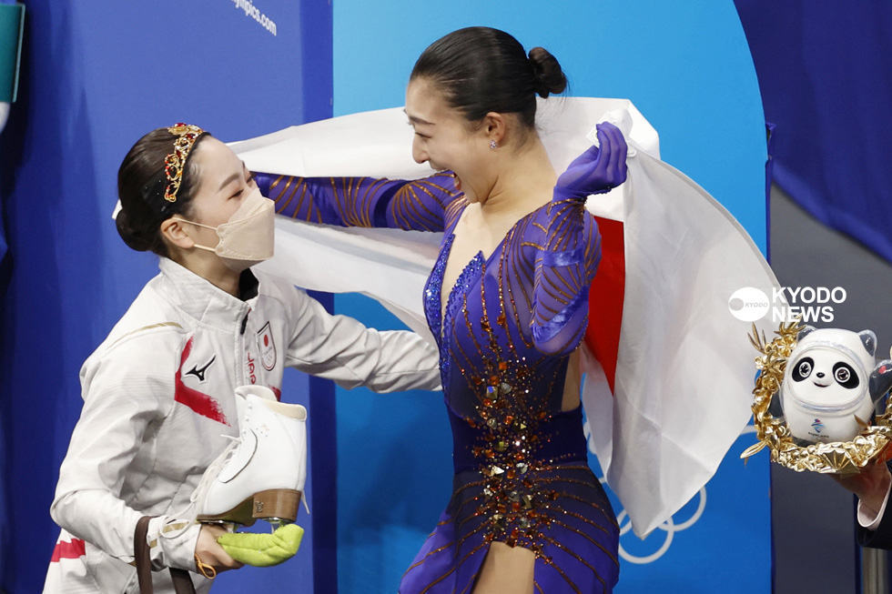 写真は #フィギュアスケート 女子シングルで #銅メダル を獲得し、セレモニー後、#樋口新葉 選手に祝福される #坂本花織 選手です。(く)#ビンドゥンドゥン pic.twitter.com/yT7J6Nhckr