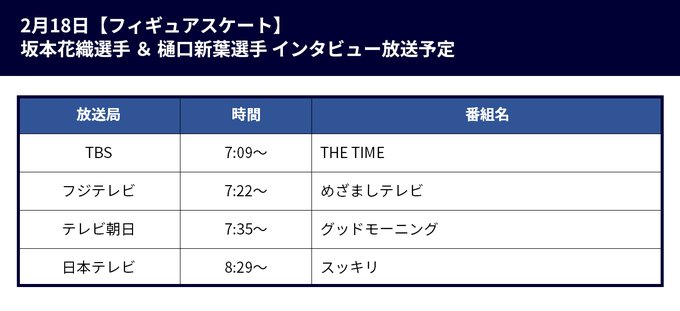 明日2/18朝、北京オリンピック #フィギュアスケート 女子シングルの #坂本花織 選手🥉と #樋口新葉 選手が各局のテレビ番組に生出演します