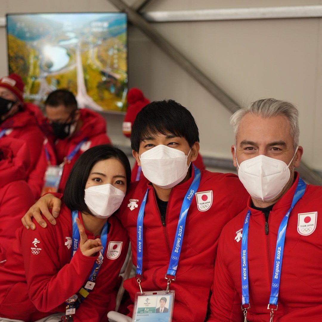 仲良く #閉会式 の始まりを待つ、りくりゅうペアとコーチ🥰⛸